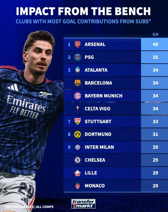 4月8日讯 在欧冠淘汰赛首回合阿森纳1-0击败葡体的比赛中,两位替补登场的球员连线,马丁内利助攻哈弗茨破门。德转也盘点了本赛季五大联赛球队在各项赛事由替补球员参与进球榜,具体如下: