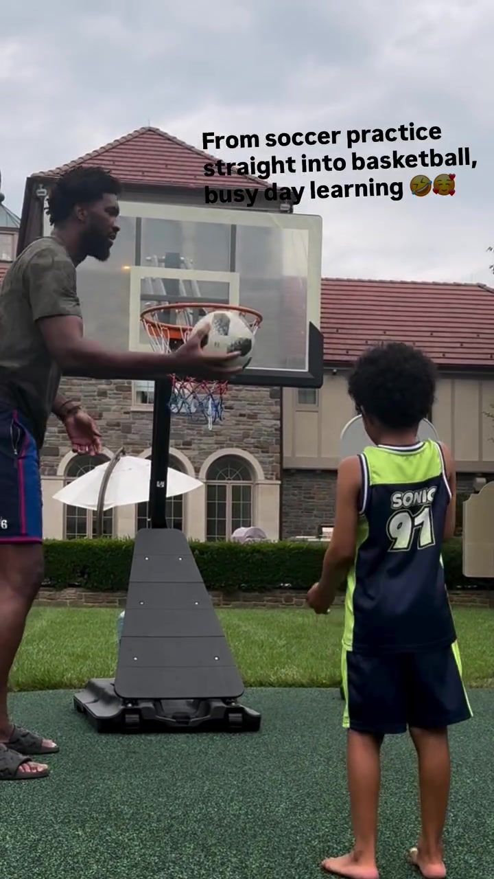 亲子时光🥰恩比德用足球教儿子打篮球 后者3投全部空心入网