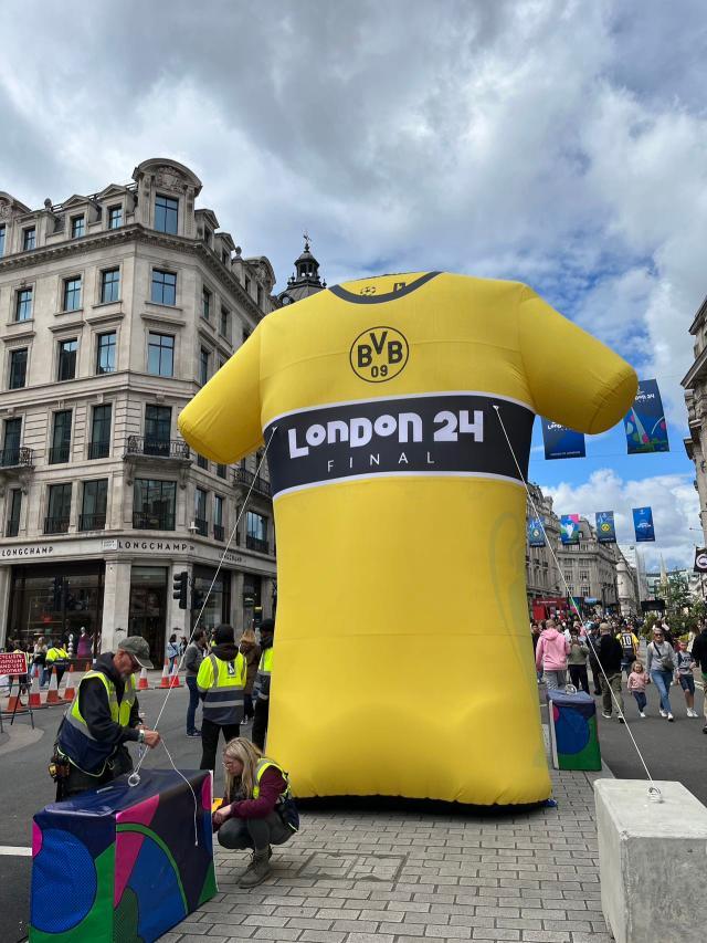 和冷清的温布利相比,当天伦敦的热闹之处其实在市中心的摄政街上。这条伦敦最为宽敞气派的大街当天彻底封路,写有“伦敦 24 决赛”的拱门在摄政街两侧的出入口处竖起,路中央搭建了一座临时舞台,背景屏幕上播放着两队晋级决赛的进球集锦,舞台上定时会有美声合唱,将欧冠主题曲的旋律放送到隔壁的牛津街和皮卡迪利广场,以吸引更多人气。这里沿街除了赞助商的各种体验活动之外,欧足联还在这里露天搭建了数处可供打卡拍照的景点,既有两队的巨型球衣展示,还有模拟新闻发布会的场景,吸引了一众行人围观拍照。不过,这里吸引的主要还是那些原本就要来此购物的游人。你甚至会听到排队拍照的人群里有人迷惑地询问同伴:“这两支球队下个月还会去德国参加欧洲杯么?”