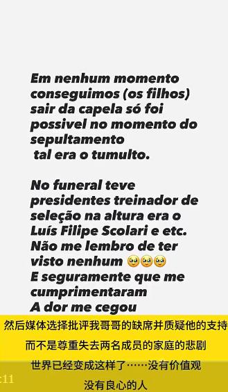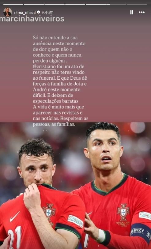 C罗的姐姐妹妹都发声,C罗二姐katia发布多条动态,媒体和评论员过分关注其他人的缺席,而不是尊重一个因失去两人而悲痛的家庭。并非所有的缺席都是不敬,自己的父亲去世时,除了痛苦还要面对蜂拥而来的摄像机和好奇的围观者,这不是为了致敬。